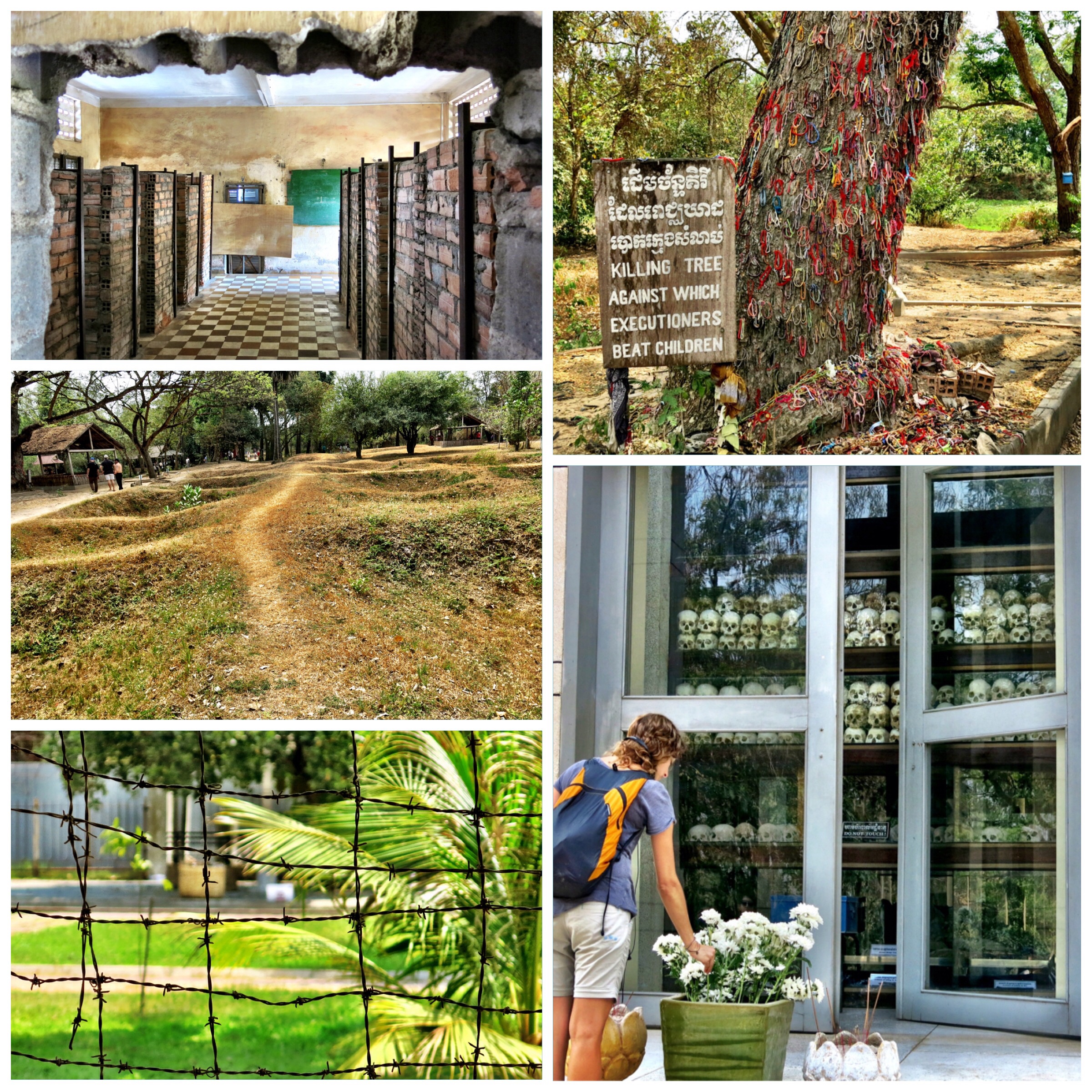 Phnom Penh also mirrors Cambodia’s tragic recent history. Our first physical approach to such sadness was visiting the Toul Sleng Genocide Museum, a school that under the Khmer Rouge regime of the 1970s was turned into a prision. There, people were brutally tortured before being sent to the Killing Fields, a place that we also visited, where thousands of people spent the very last agonizing moments of their lives. At the killing fields people were murdered with knives, axes, bamboo sticks, and any imaginable hand weapon that did not include bullets; these were considered too expensive and a waste of money. Finally they were buried in mass graves, which were enormous ditches dug into the ground.
