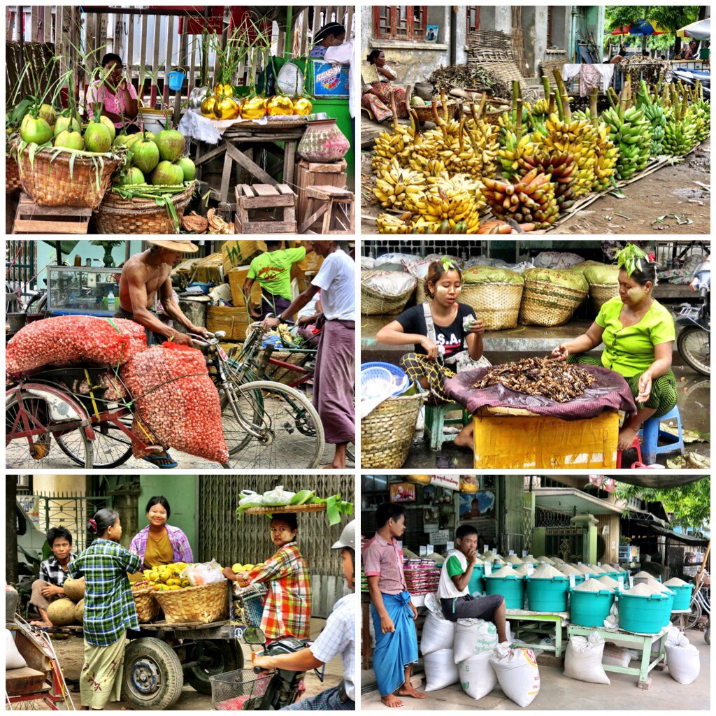 The market was next to our guesthouse and its surrounding streets were adorned with color. Vegetables, fruits, nuts, insects, animals, fish, and anything you could imagine to eat were everywhere. It wasn’t only the appealing way in which the food was presented, always in large quantities laying inside woven bamboo baskets and ancient looking carts. It was the vendor’s posture squatting or peacefully sitting around their treasure like on a throne, yet really on a dirt road. It was the way they looked about often with an innocent gaze, smiling when you made eye contact. It was the traditional clothing, and their yellow cheeks painted with a paste called Tanaka, to protect themselves against the sun. What a nice experience…