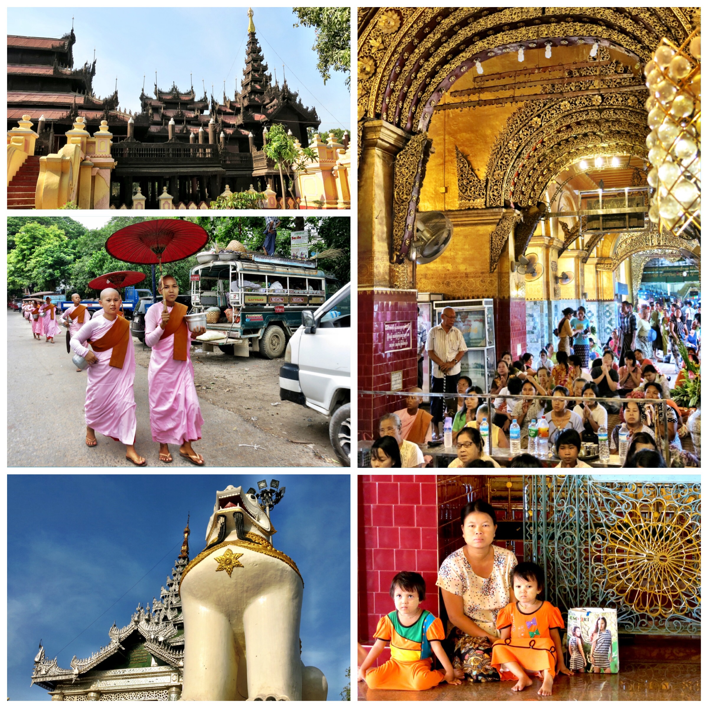 We were brought to see 3 temples made of different materials, including teakwood, marble, and gold. All were very beautiful, however the last temple, the Mahamuni Pagoda, was very special. It is one of the most important temples in the country, and was filled with locals as well as Burmese visiting from all parts of the country to pay their respects. We entered the main pagoda through a walkway whose seashell green paint was chipping off the walls, where locals had set up little shops that also seemed to be their homes. The children running around, the expression on peoples’ faces, the women sitting on the floor deep in their prayers, the colorful clothing… There was such a mystical atmosphere.